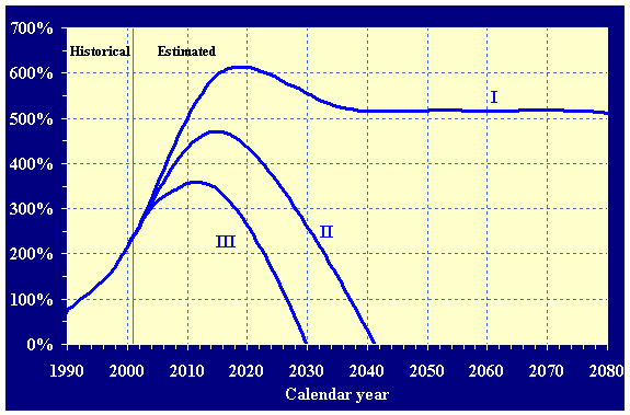 As the chart below from the SS Trustees' 2002 annual report shows, their "best guess" middle projection of Trust Fund assets, based on 5 1/2% average unemployment for the foreseeable future (#2 on the chart) does "go bankupt" in 2042, as widely reported. (The Trustees have been pushing this date ahead about every year, as the always unreliable and ever-changing economic projections become more optimistic.) But their 4 1/2% "low cost" projection (#1 on the chart) is financially healthy for the full 75 years.
