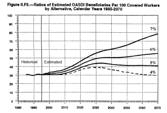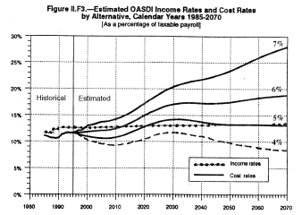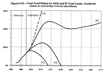 Three graphs from the Social Security trustees' 1996 report