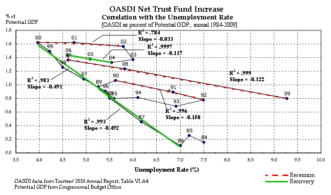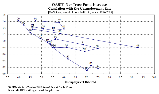 The Trustees' annual report (Appendix VI, Table A4) provides the financial data [5] that govern the Trust Fund's level of assets, as shown in the Trustees' chart of long-term projections, Figure 1, above.The data series that is of primary interest here is the Net Trust Fund Increase (NTFI), the difference between the Fund's income and expenses. Because it constitutes the growth of the Trust Fund, it is what must be supplemented in recessions by the proposed "unemployment insurance," and its relationship to unemployment is what determines the appropriate level of such supplementation.